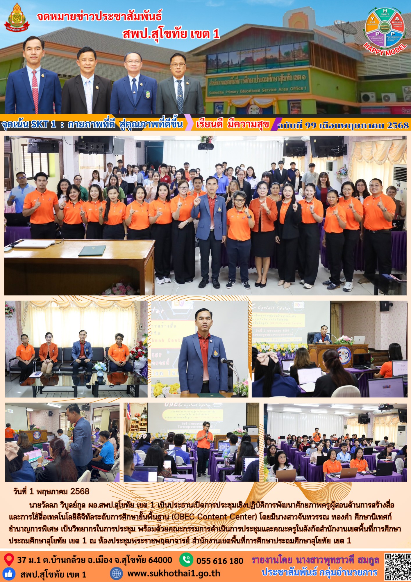 นายวัลลภ วิบูลย์กูล ผอ.สพป.สุโขทัย เขต 1 เป็นประธานเปิดการประชุมเชิงปฏิบัคิการพัฒนาศักยภาพครูผู้สอนด้านการสร้างสื่อและการใช้สื่อเทคโนโลยีดิจิทัลระดับการศึกษาขั้นพื้นฐาน (OBEC Content Center) รุ่นที่ 1 อำเภอเมืองและอำเภอคีรีมาศ โดยมีนางสาวจันทวรรณ ทองคำ ศึกษานิเทศก์ชำนาญการพิเศษ เป็นวิทยากรในการประชุม พร้อมด้วยคณะกรรมการดำเนินการประชุมและคณะครูในสังกัดสำนักงานเขตพื้นที่การศึกษาประถมศึกษาสุโขทัย เขต 1 ณ ห้องประชุมพระราชพฤฒาจารย์ สำนักงานเขตพื้นที่การศึกษาประถมศึกษาสุโขทัย เขต 1