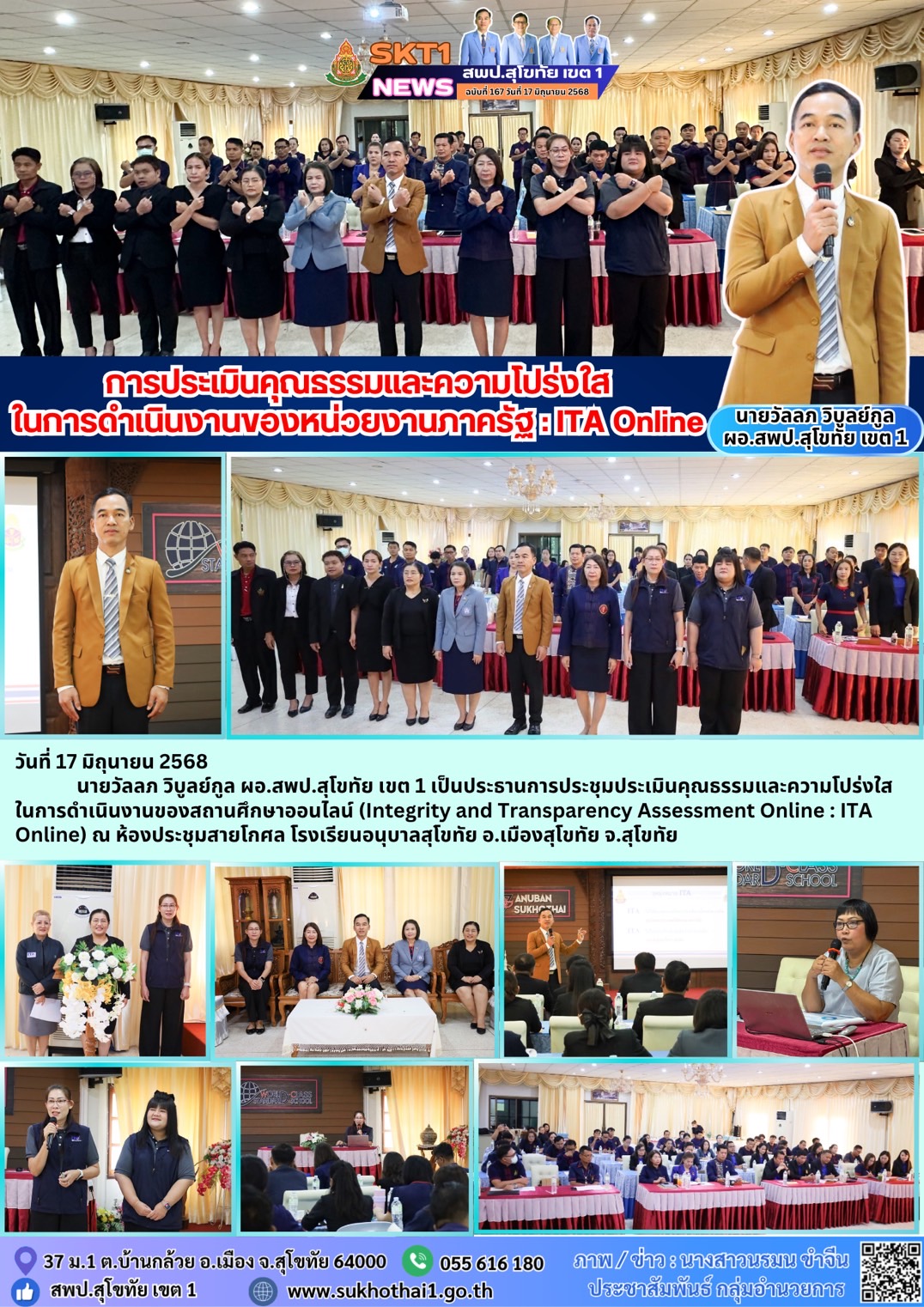 นายวัลลภ วิบูลย์กูล ผอ.สพป.สุโขทัย เขต 1 เป็นประธานการประชุมประเมินคุณธรรมและความโปร่งใสในการดำเนินงานของสถานศึกษาออนไลน์ ( Integrity and Transparency Assessment Online : ITA Online ) ณ ห้องประชุมสายโกศล โรงเรียนอนุบาลสุโขทัย อ.เมืองสุโขทัย จ.สุโขทัย