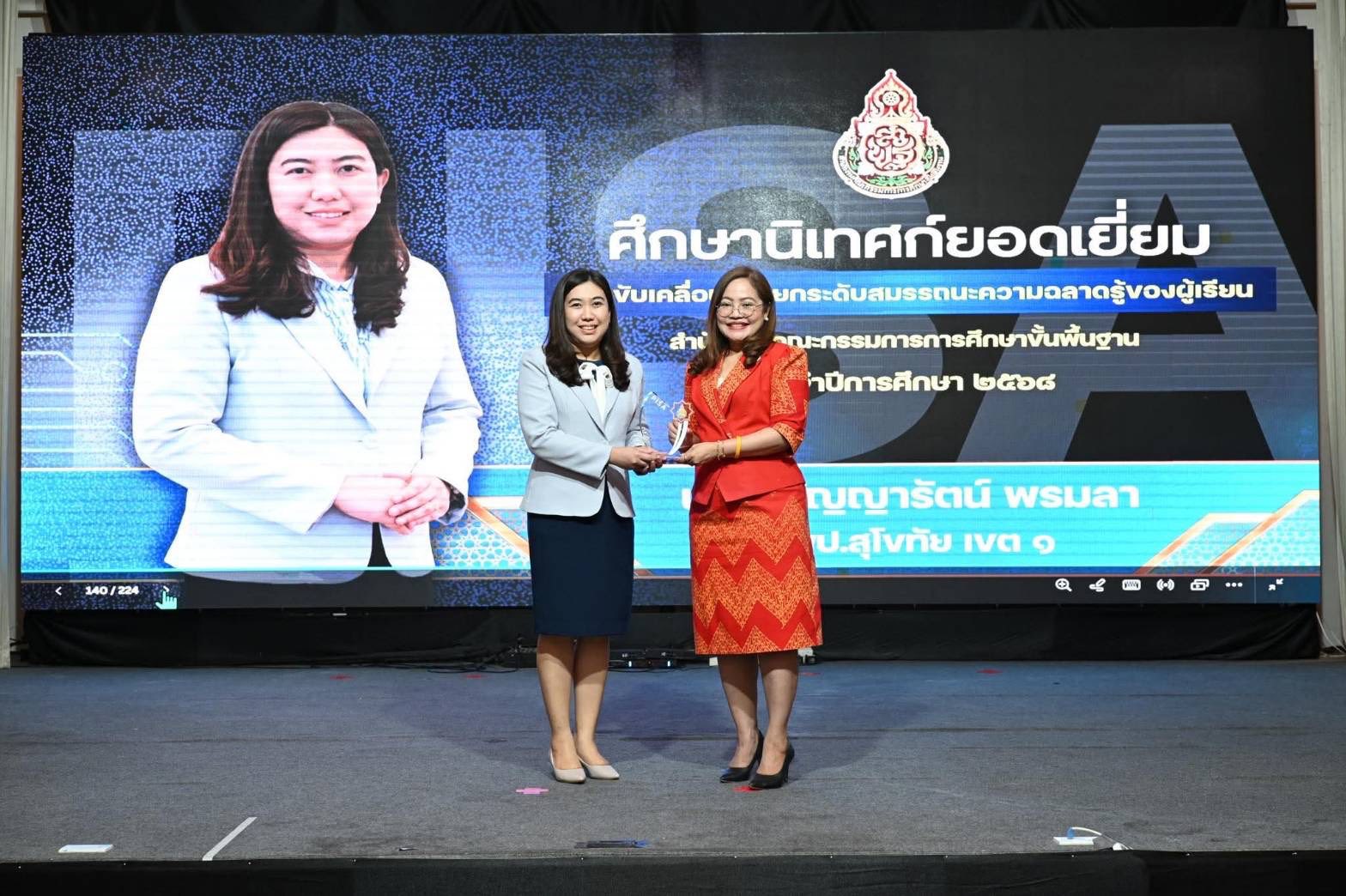 สุโขทัย เขต 1 ขอแสดงความยินดี กับนางศรัญญารัตน์ พรมลา ศึกษานิเทศก์ชำนาญการพิเศษเนื่องในโอกาสได้รับรางวัล ศึกษานิเทศก์ยอดเยี่ยม การขับเคลื่อนการยกระดับ สมรรถนะความฉลาดรู้ของผู้เรียน สำนักงานคณะกรรมการการศึกษาขั้นพื้นฐาน ประจำปีการศึกษา 2568