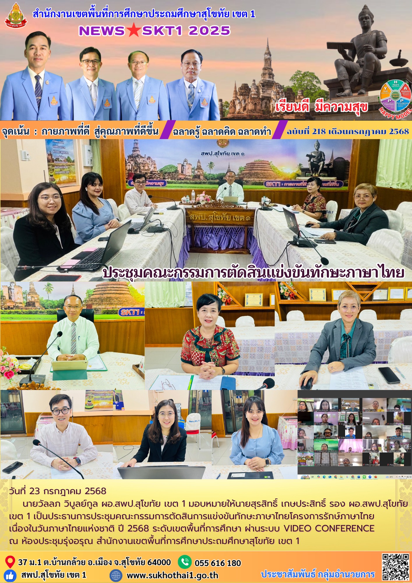 นายวัลลภ วิบูลย์กูล ผอ.สพป.สุโขทัย เขต 1 มอบหมายให้นายสุรสิทธิ์ เกษประสิทธิ์ รอง ผอ.สพป.สุโขทัย เขต 1 เป็นประธานการประชุมคณะกรรมการตัดสินการแข่งขันทักษะภาษาไทยโครงการรักษ์ภาษาไทย เนื่องในวันภาษาไทยแห่งชาติ ปี 2568 ระดับเขตพื้นที่การศึกษา ผ่านระบบ Video Conference ณ ห้องประชุมรุ่งอรุณ สำนักงานเขตพื้นที่การศึกษาประถมศึกษาสุโขทัย เขต 1