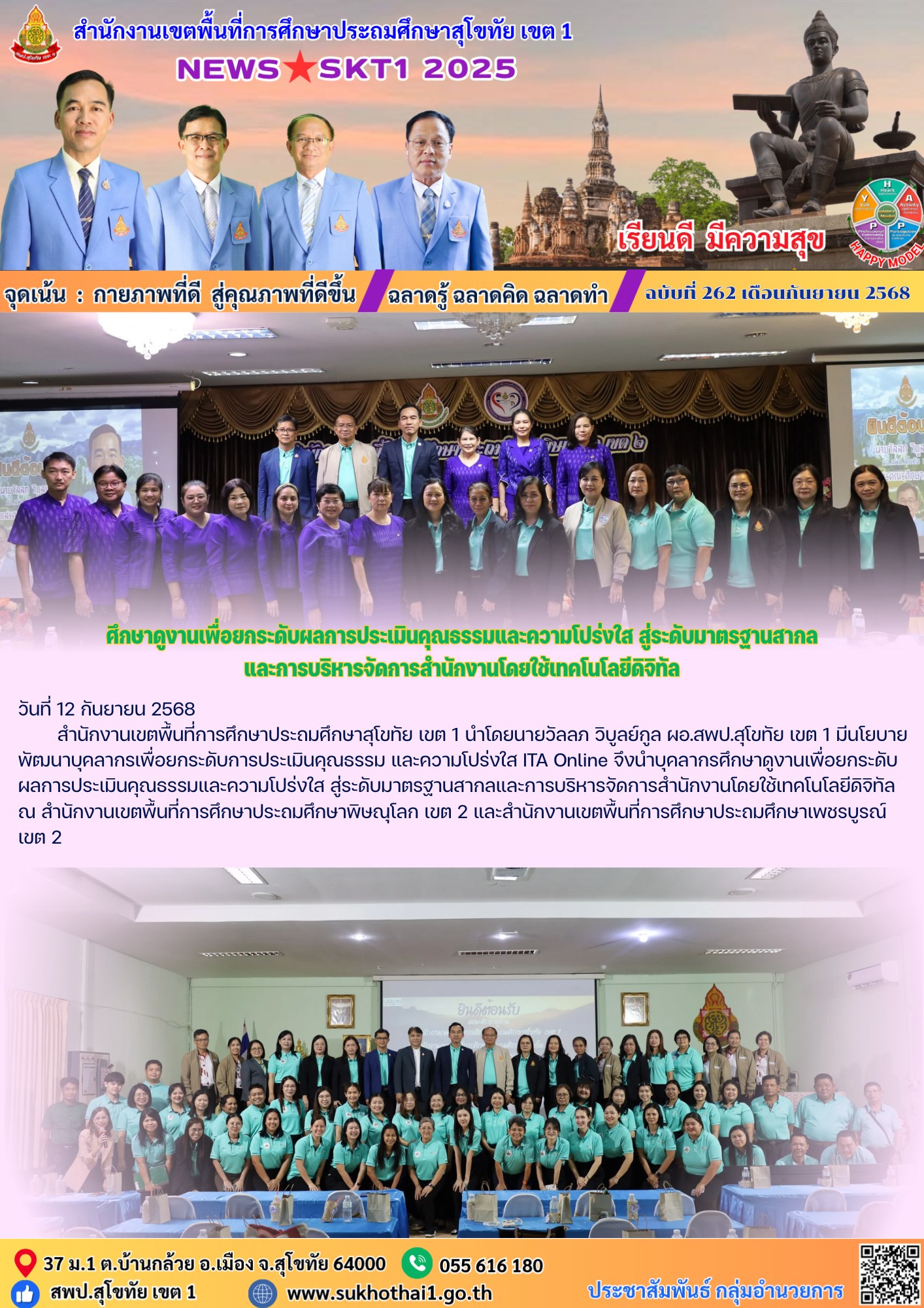 สำนักงานเขตพื้นที่การศึกษาประถมศึกษาสุโขทัย เขต 1 นำโดยนายวัลลภ วิบูลย์กูล ผอ.สพป.สุโขทัย เขต 1 มีนโยบายพัฒนาบุคลากรเพื่อยกระดับการประเมินคุณธรรม และความโปร่งใส ITA Online จึงได้จัดการศึกษาดูงานเพื่อยกระดับผลการประเมินคุณธรรมและความโปร่งใส สู่ระดับมาตรฐานสากลและการบริหารจัดการสำนักงานโดยใช้เทคโนโลยีดิจิทัล ณ สำนักงานเขตพื้นที่การศึกษาประถมศึกษาพิษณุโลก เขต 2 และสำนักงานเขตพื้นที่การศึกษาประถมศึกษา เพชรบูรณ์ เขต 2
