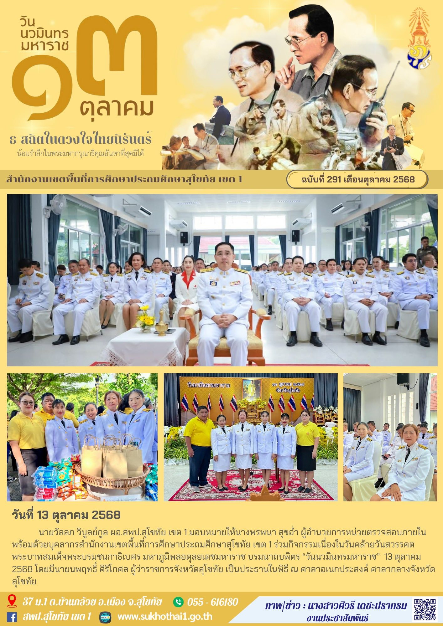นายวัลลภ วิบูลย์กูล ผอ.สพป.สุโขทัย เขต 1 มอบหมายให้นางพรพนา สุขอ่ำ ผู้อำนวยการหน่วยตรวจสอบภายใน พร้อมด้วยบุคลากรสำนักงานเขตพื้นที่การศึกษาประถมศึกษาสุโขทัย เขต 1 ร่วมกิจกรรมเนื่องในวันคล้ายวันสวรรคต พระบาทสมเด็จพระบรมชนกาธิเบศร มหาภูมิพลอดุลยเดชมหาราช บรมนาถบพิตร “วันนวมินทรมหาราช” 13 ตุลาคม 2568 โดยมีนายนพฤทธิ์ ศิริโกศล ผู้ว่าราชการจังหวัดสุโขทัย เป็นประธานในพิธี ณ ศาลาอเนกประสงค์ ศาลากลางจังหวัดสุโขทัย