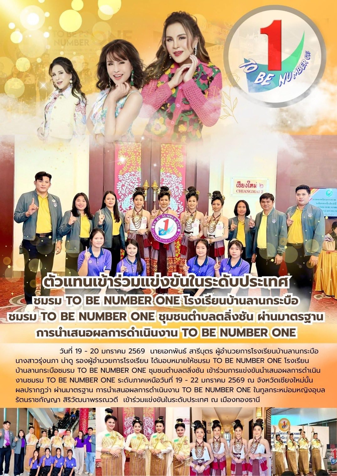 วันที่ สพป. สุโขทัย เขต 1 ขอแสดงความยินดีกับนักเรียน คณะครู โรงเรียนบ้านลานกระบือ สังกัด สพป. สุโขทัย เขต 1 นำโดยท่าน ผอ. เอกพันธ์ สารีบุตร และรอง ผอ.รุ่งนภา น่าดู เนื่องในโอกาสผ่านมาตรฐานการนำเสนอผลงาน TO BE NUMBER ONE ระดับภาคเหนือในวันที่ 19- 20 มกราคม 2569 ณ จังหวัดเชียงใหม่ เพื่อเตรียมตัวแข่งขันการนำเสนอผลการดำเนินงาน TO BE NUMBER ONE ในทูลกระหม่อมหญิงอุบลรัตนราชกัญญา สิริวัฒนาพรรณวดี ในระดับประเทศ ณ เมืองทองธานี ต่อไป โดยมีนักเรียนเข้าร่วมการแข่งขันในครั้งนี้ ได้แก่