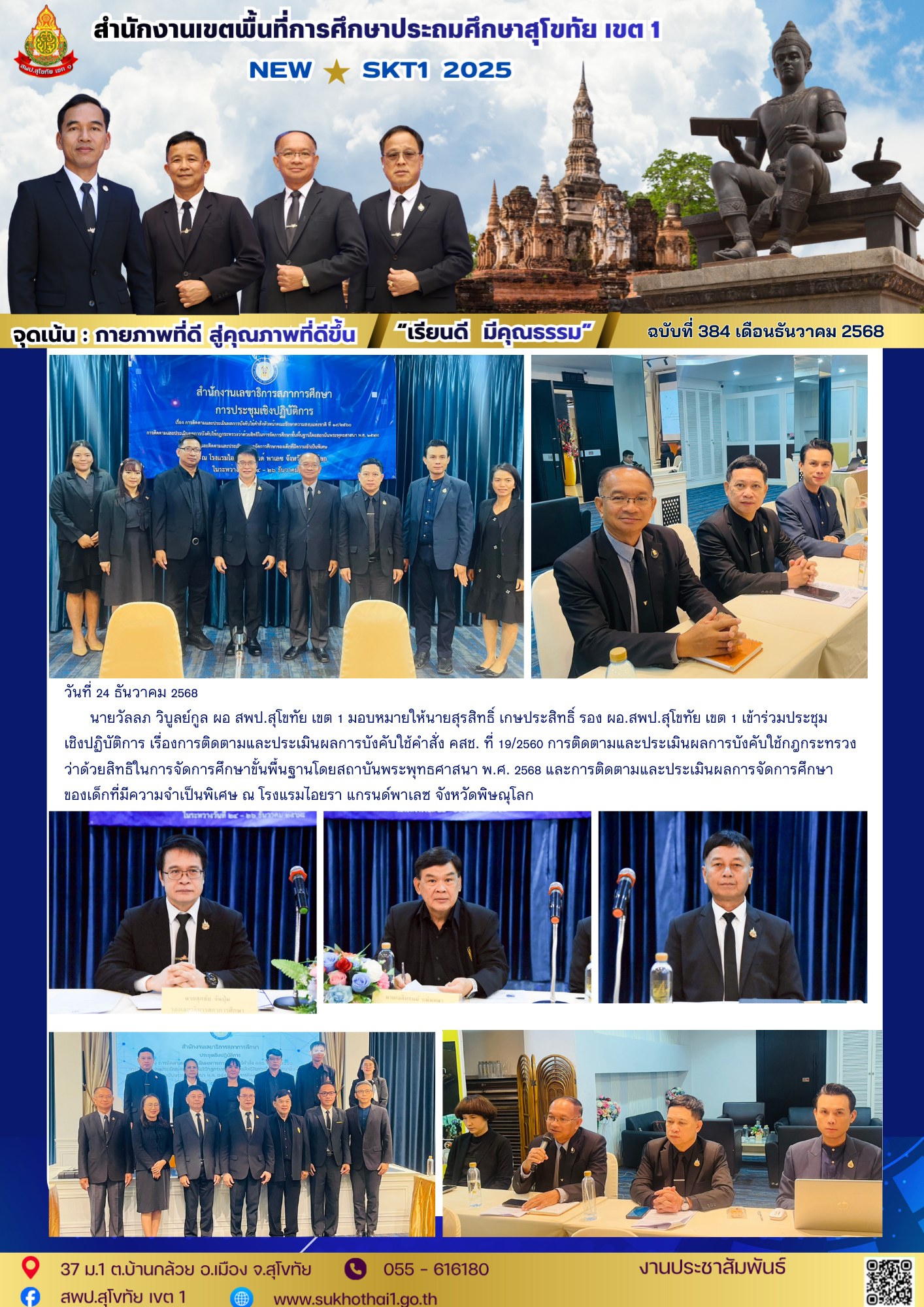 นายวัลลภ วิบูลย์กูล ผอ สพป.สุโขทัย เขต 1 มอบหมายให้นายสุรสิทธิ์ เกษประสิทธิ์ รอง ผอ.สพป.สุโขทัย เขต 1 เข้าร่วมประชุมเชิงปฏิบัติการ เรื่องการติดตามและประเมินผลการบังคับใช้คำสั่ง คสช. ที่ 19/2560 การติดตามและประเมินผลการบังคับใช้กฎกระทรวงว่าด้วยสิทธิในการจัดการศึกษาขั้นพื้นฐานโดยสถาบันพระพุทธศาสนา พ.ศ. 2568 และการติดตามและประเมินผลการจัดการศึกษาของเด็กที่มีความจำเป็นพิเศษ ณ โรงแรมไอยรา แกรนด์พาเลซ จังหวัดพิษณุโลก