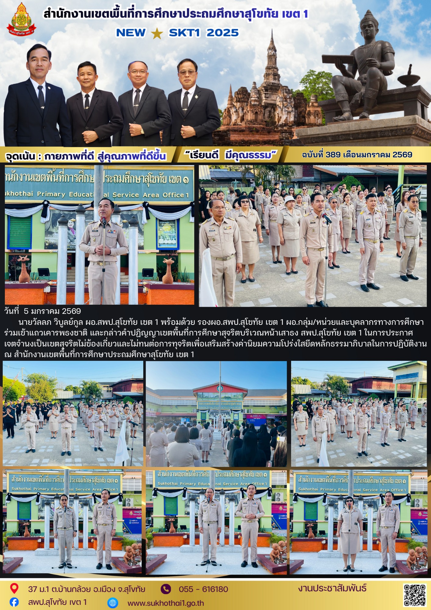 นายวัลลภ วิบูลย์กูล ผอ.สพป.สุโขทัย เขต 1 พร้อมด้วย รองผอ.สพป.สุโขทัย เขต 1 ผอ.กลุ่ม/หน่วยและบุคลากรทางการศึกษาร่วมเข้าแถวเคารพธงชาติ และกล่าวคำปฏิญญาเขตพื้นที่การศึกษาสุจริตบริเวณหน้าเสาธง สพป.สุโขทัย เขต 1 ในการประกาศเจตจำนงเป็นเขตสุจริตไม่ข้องเกี่ยวและไม่ทนต่อการทุจริตเพื่อเสริมสร้างค่านิยมความโปร่งใสยึดหลักธรรมาภิบาลในการปฏิบัติงาน ณ สำนักงานเขตพื้นที่การศึกษาประถมศึกษาสุโขทัย เขต 1