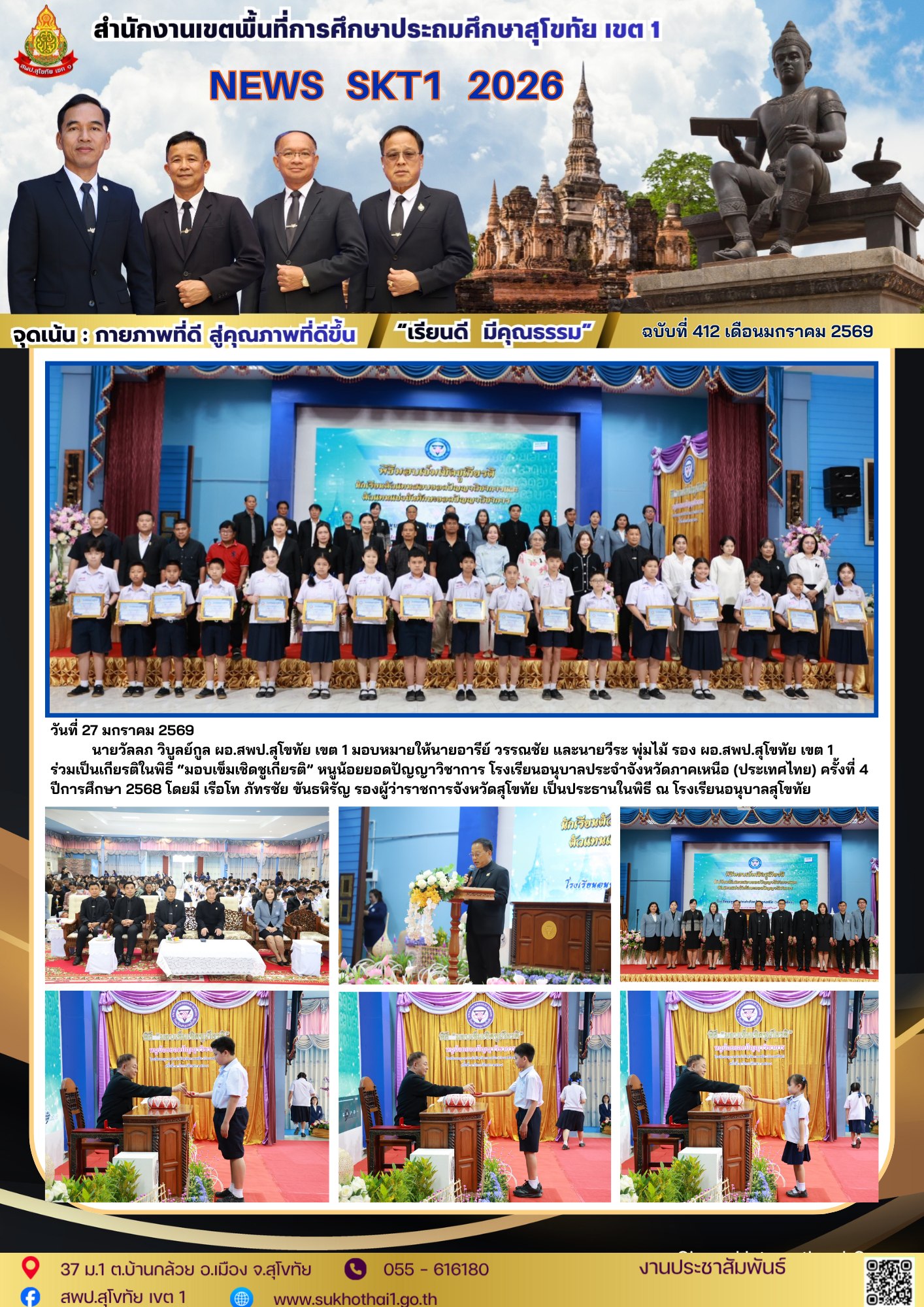 นายวัลลภ วิบูลย์กูล ผอ.สพป.สุโขทัย เขต 1 มอบหมายให้นายอารีย์ วรรณชัย และนายวีระ พุ่มไม้ รอง ผอ.สพป.สุโขทัย เขต 1 ร่วมเป็นเกียรติในพิธี “มอบเข็มเชิดชูเกียรติ” หนูน้อยยอดปัญญาวิชาการ โรงเรียนอนุบาลประจำจังหวัดภาคเหนือ (ประเทศไทย) ครั้งที่ 4 ปีการศึกษา 2568 โดยมี เรือโท ภัทรชัย ขันธหิรัญ รองผู้ว่าราชการจังหวัดสุโขทัย เป็นประธานในพิธี ณ โรงเรียนอนุบาลสุโขทัย