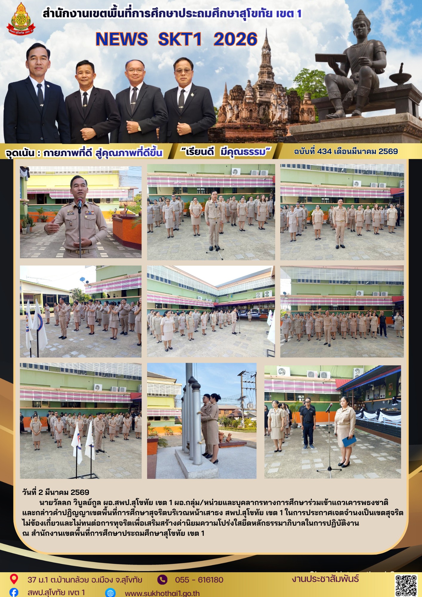 นายวัลลภ วิบูลย์กูล ผอ.สพป.สุโขทัย เขต 1 ผอ.กลุ่ม/หน่วยและบุคลากรทางการศึกษาร่วมเข้าแถวเคารพธงชาติ และกล่าวคำปฏิญญาเขตพื้นที่การศึกษาสุจริตบริเวณหน้าเสาธง สพป.สุโขทัย เขต 1 ในการประกาศเจตจำนงเป็นเขตสุจริตไม่ข้องเกี่ยวและไม่ทนต่อการทุจริตเพื่อเสริมสร้างค่านิยมความโปร่งใสยึดหลักธรรมาภิบาลในการปฏิบัติงาน ณ สำนักงานเขตพื้นที่การศึกษาประถมศึกษาสุโขทัย เขต 1